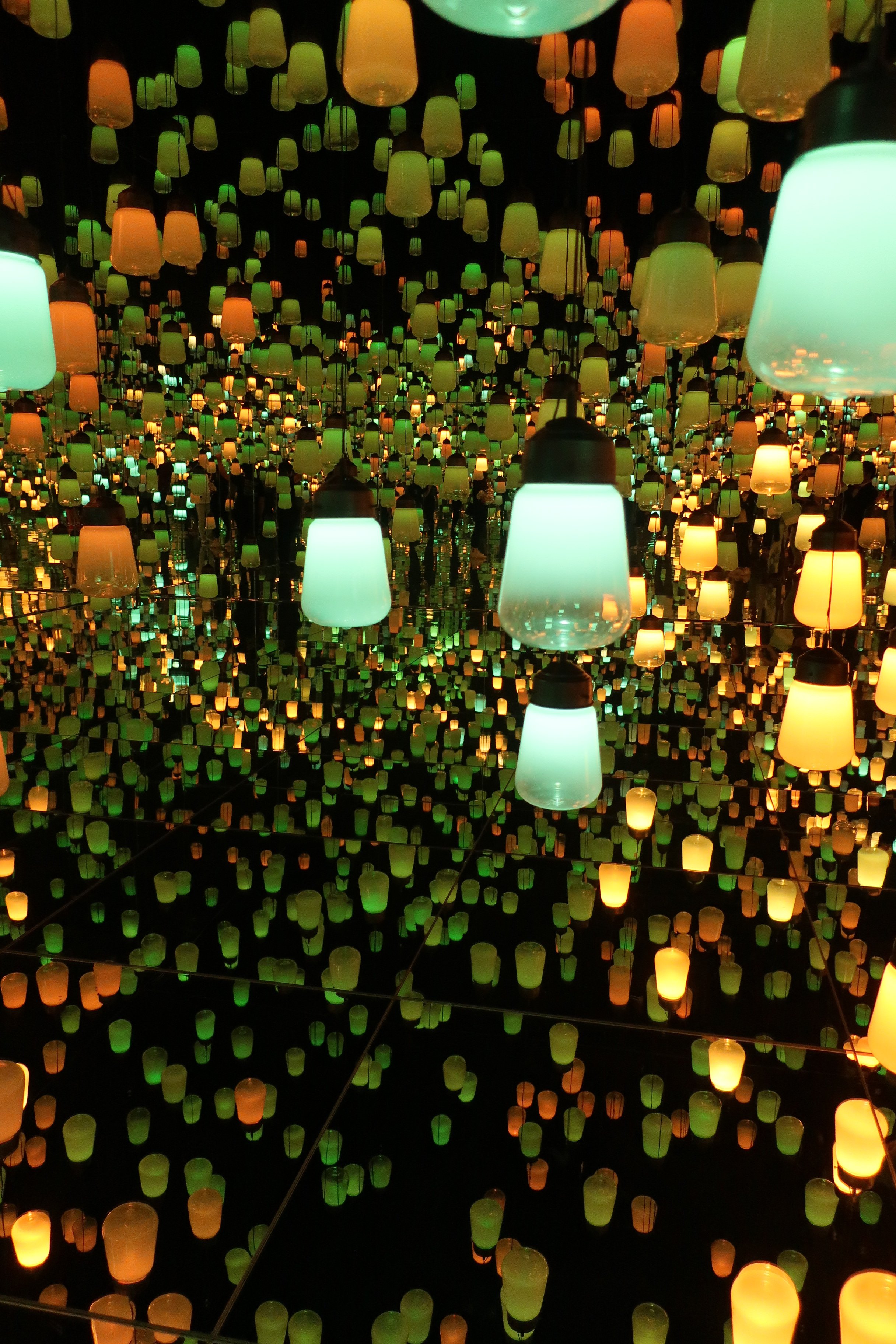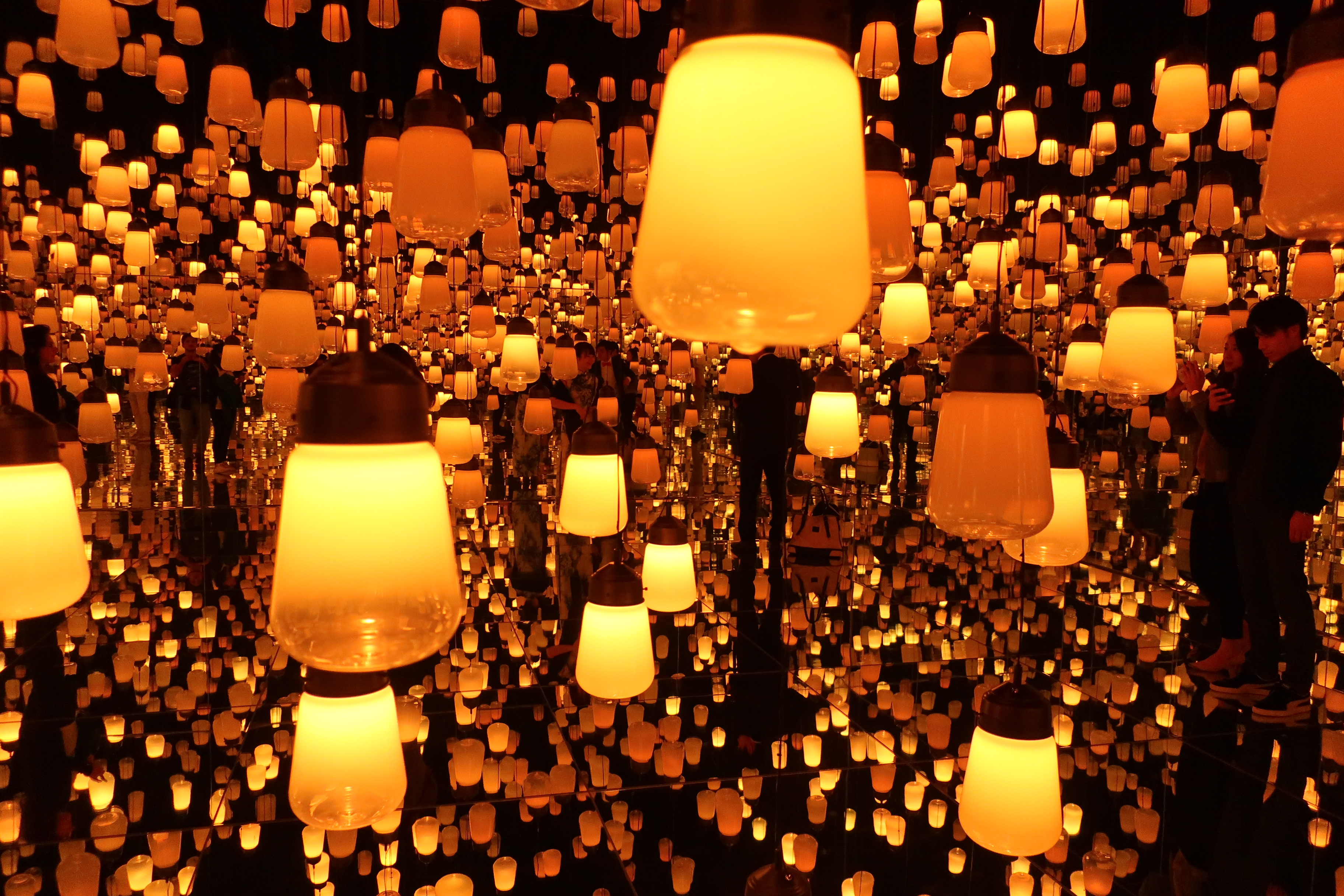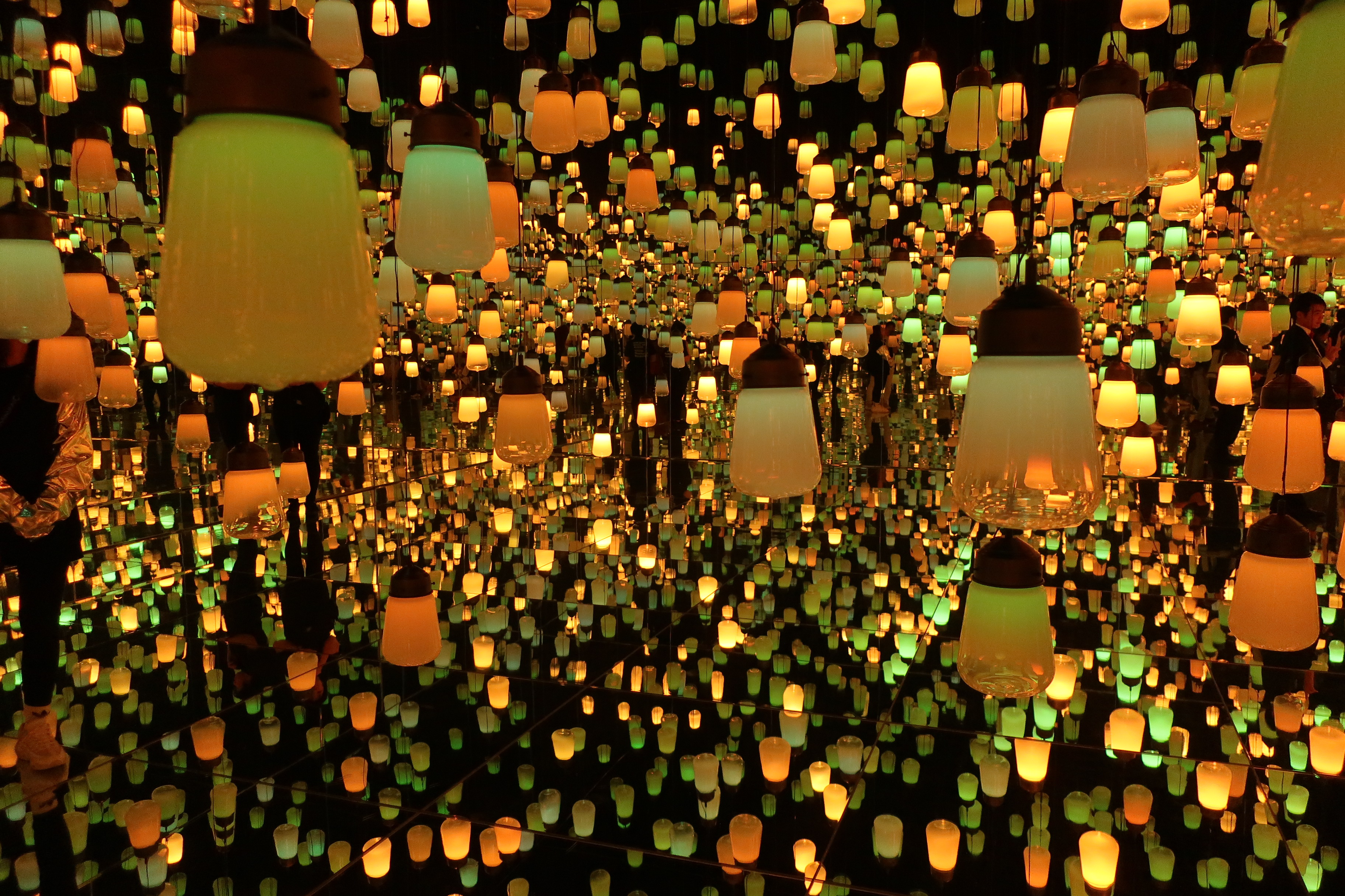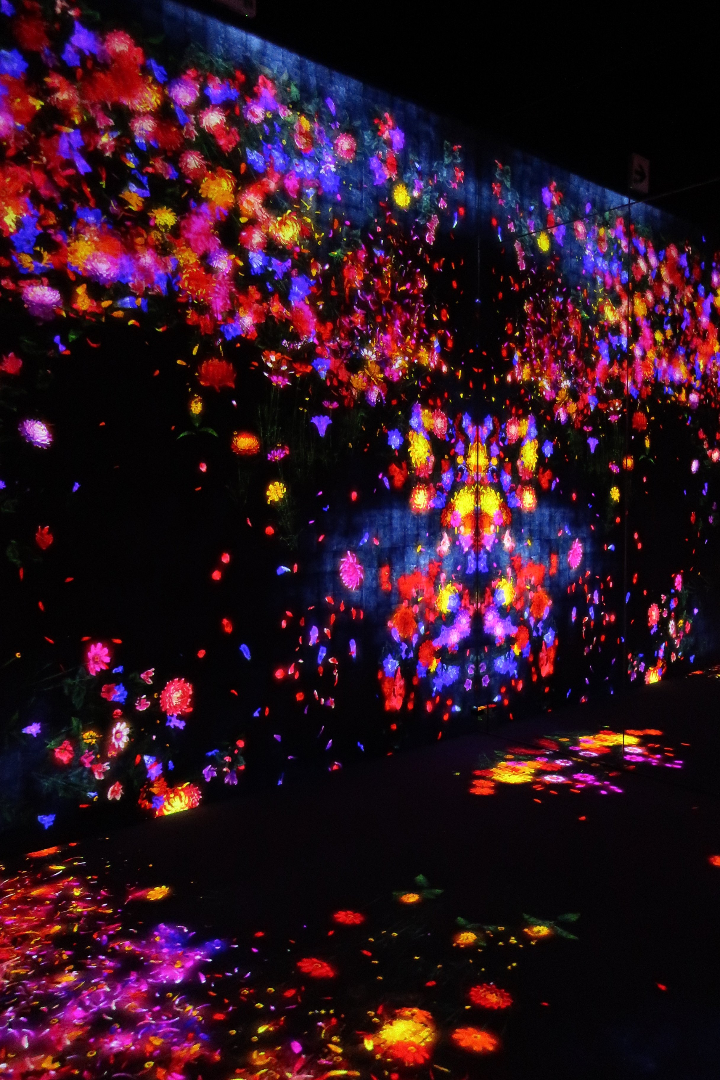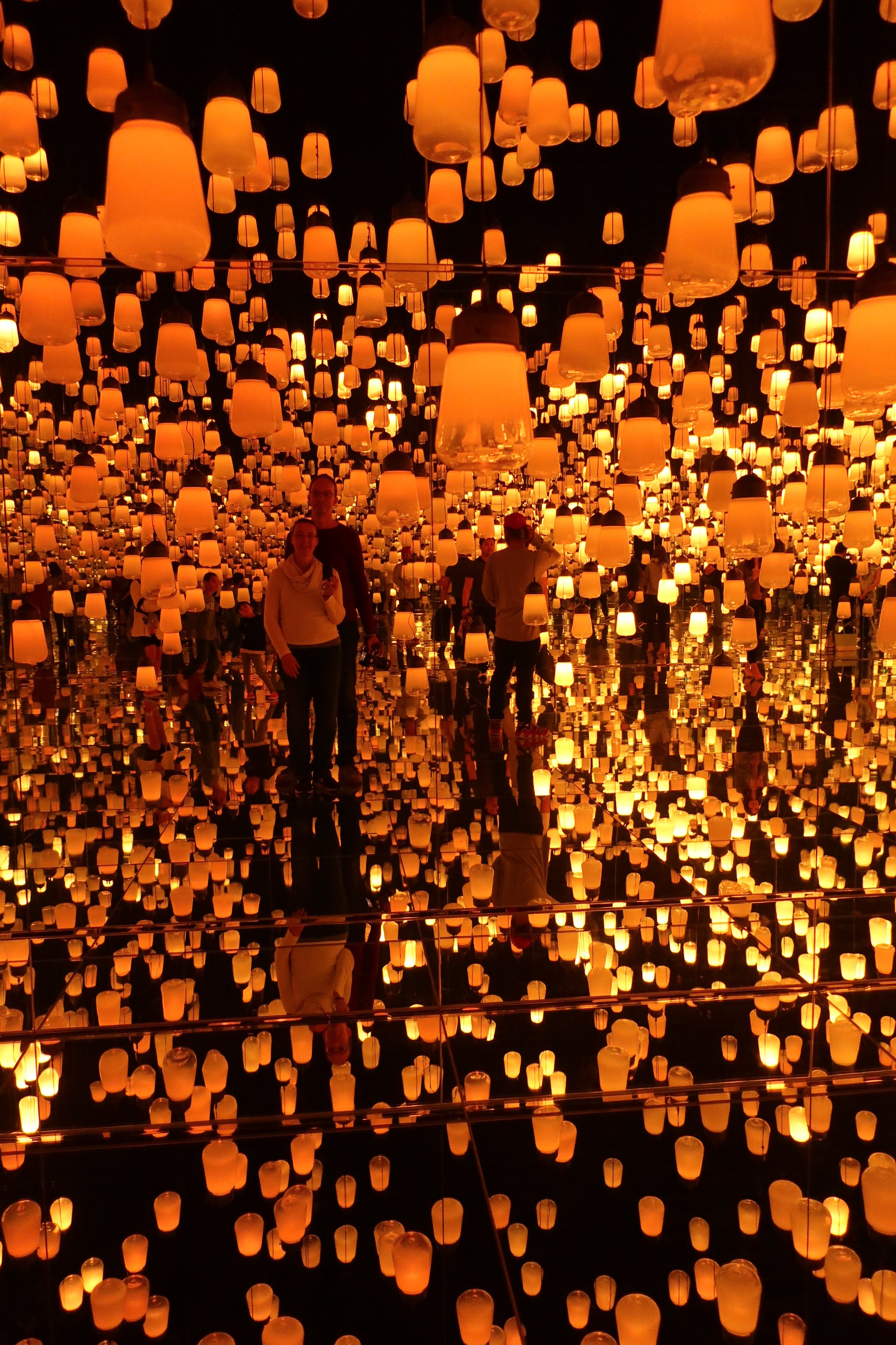 Und was uns da erwartete ist nur sehr, sehr schwer in Worte zu fassen. Und auch nicht so richtig in Bildern zu kommunizieren. So etwas hatten wir noch nie zuvor gesehen und es war ziemlich überwältigend. In einem Labyrinth von unzähligen kleinen und großen Räumen gibt es unterschiedlichste Installationen mit Licht, Projektionen mit Beamern (laut Website knapp 600 davon) und das alles passend untermalt mit spherischen klängen (oder mit viel Bass, je nach Raum). Da ist ein großer, verwinkelter Raum mit sich bewegenden Blumen, herum fliegenden Schmetterlingen und einem Wasserfall aus Licht. Oder der “Lantern Forest” bei dem man durch einen Wald von Glühbirnen wandelt. Oder ein bunter, Wabern der Nebel aus LED Leuchten, bei dem man vor lauter Spiegeln den Ausgang gar nicht richtig erkennen kann… Oder eine Tee Zeremonie bei der sich in der gläsernen Teeschale eine leuchtende Blume bildet, die verwelkt wenn man daraus trinkt und danach wieder von vorne zu wachsen beginnt… Einfach unbeschreiblich. Am besten selber hingehen und erleben. Wir waren über drei Stunden drin. Und wenn sie um 19 Uhr nicht geschlossen hätten wären wir da sicherlich auch noch länger drin geblieben…