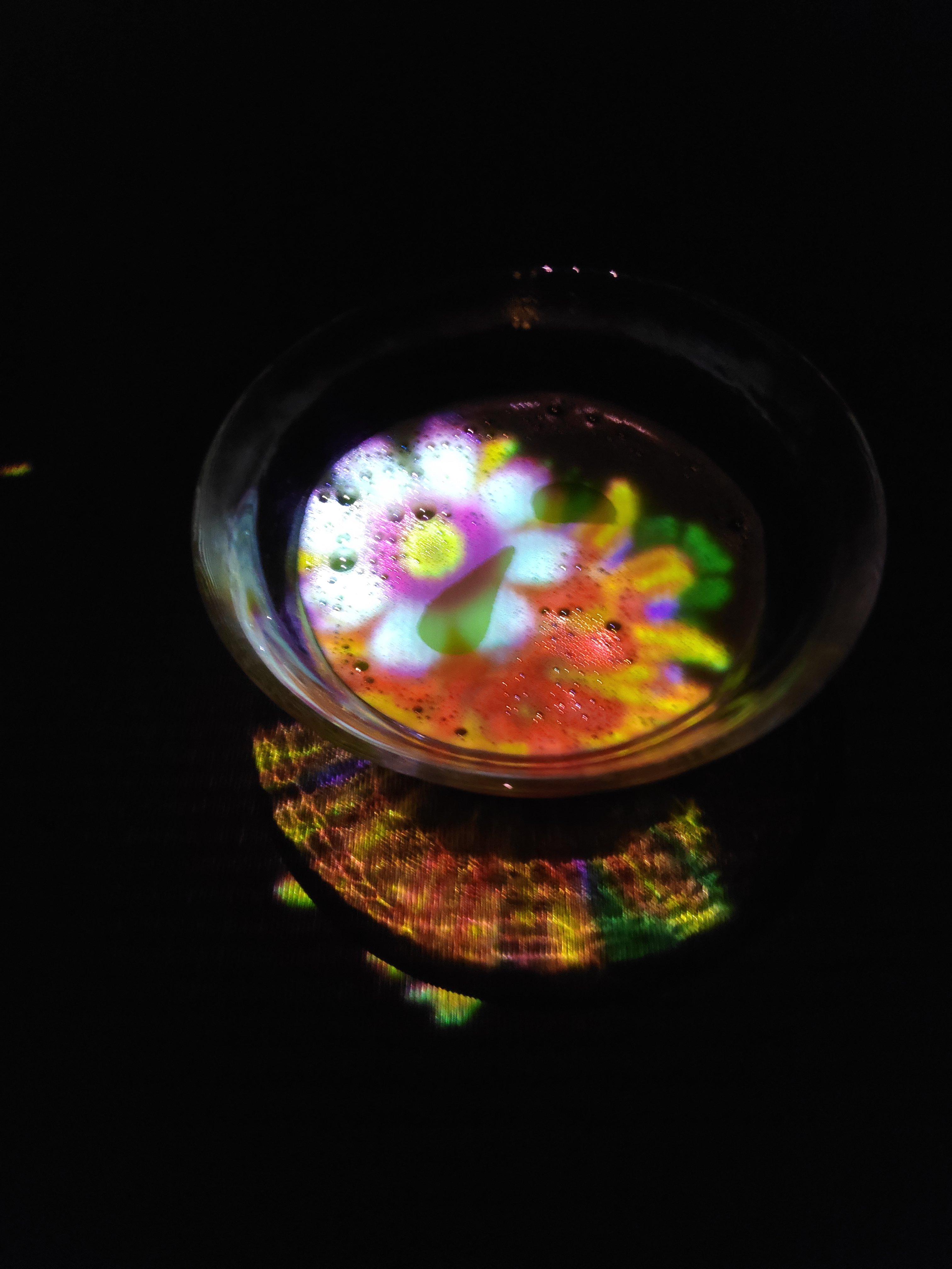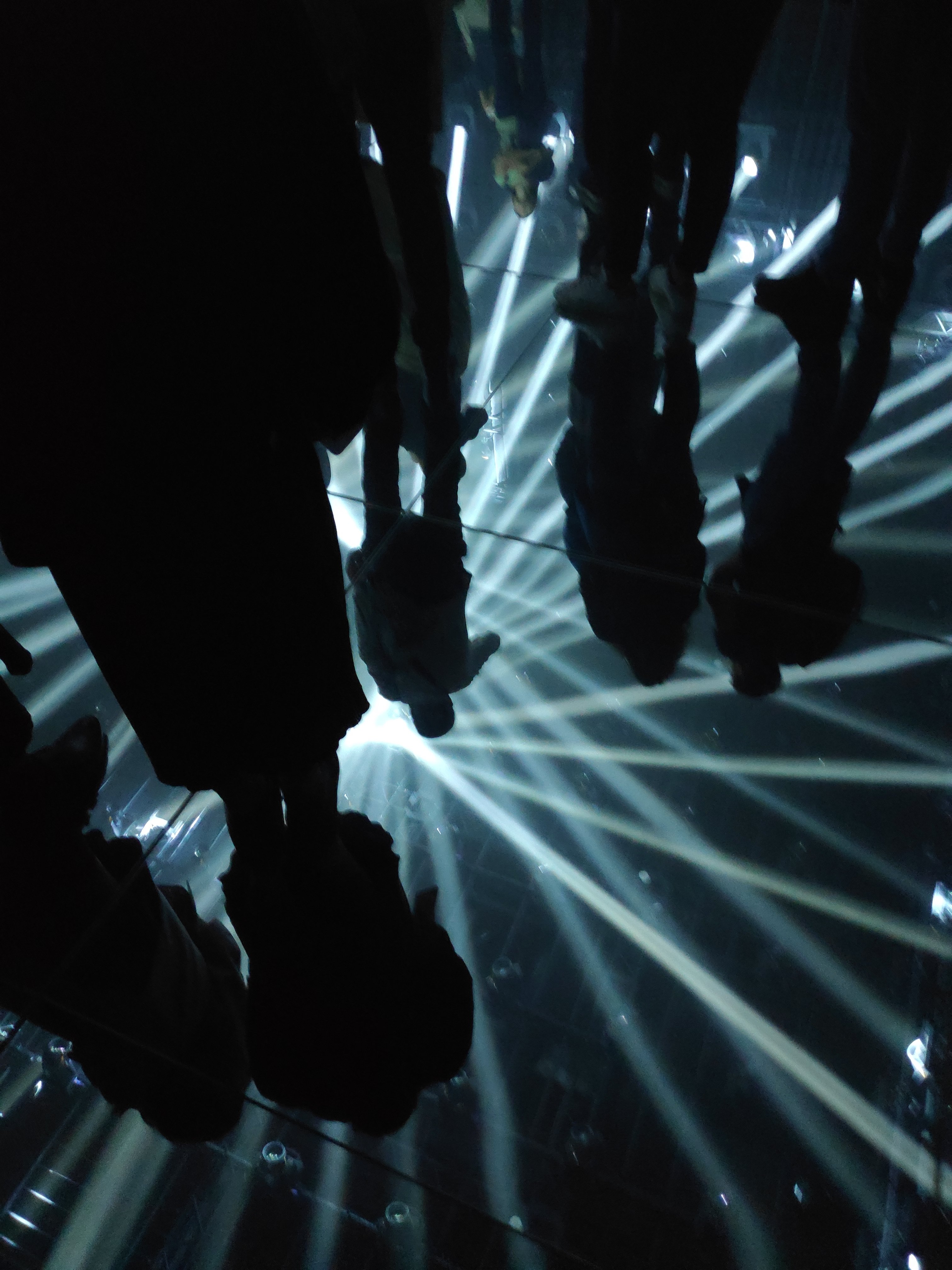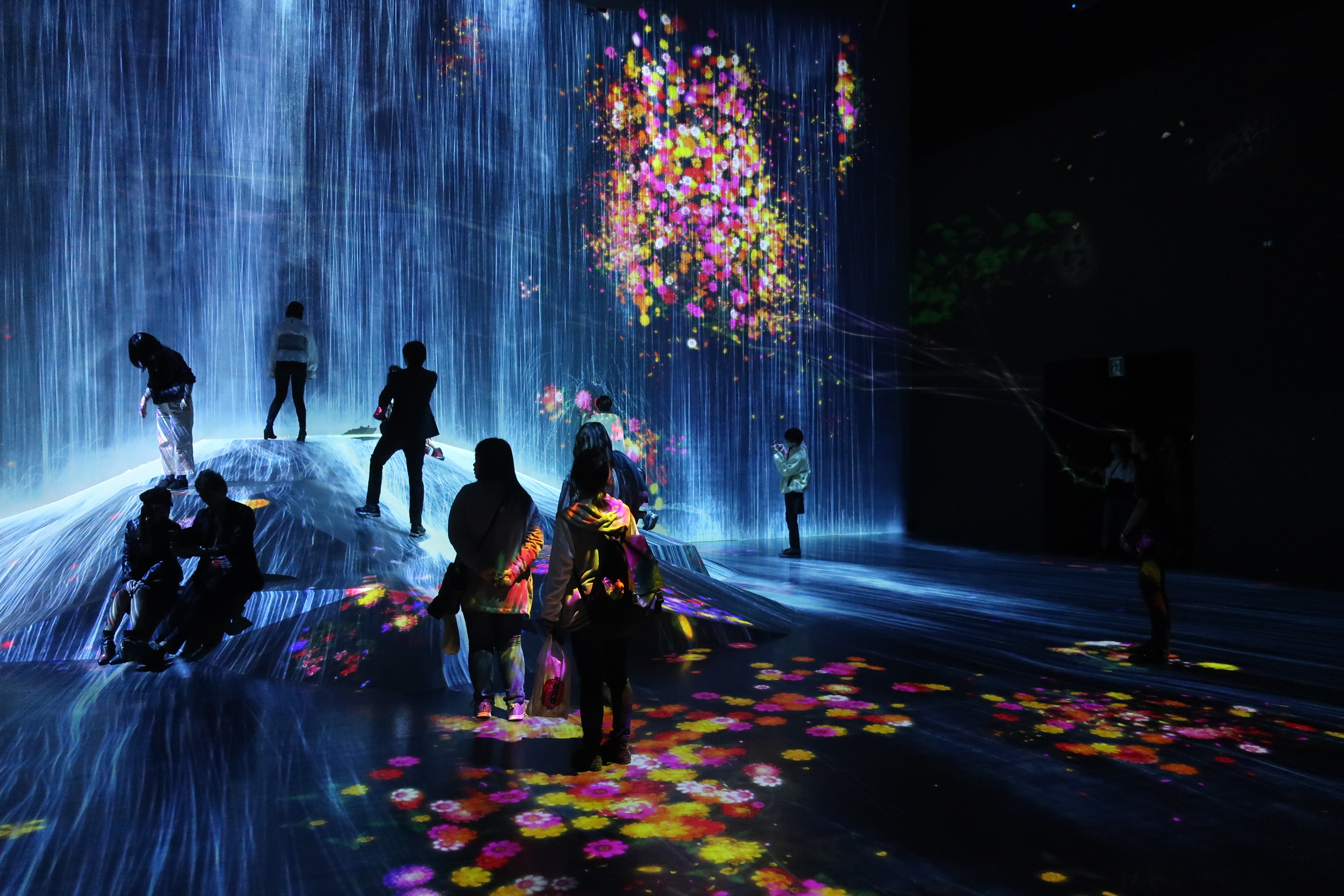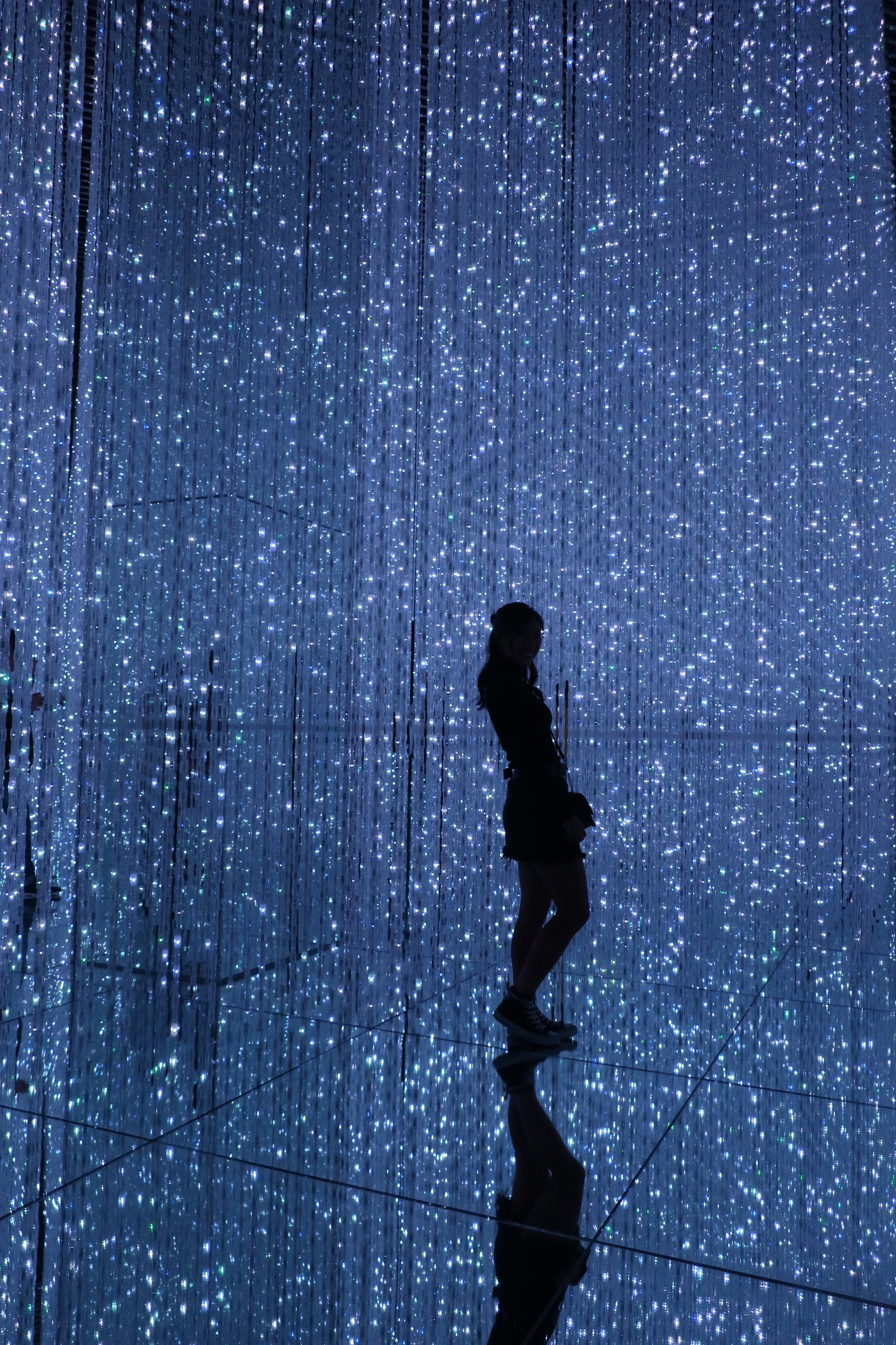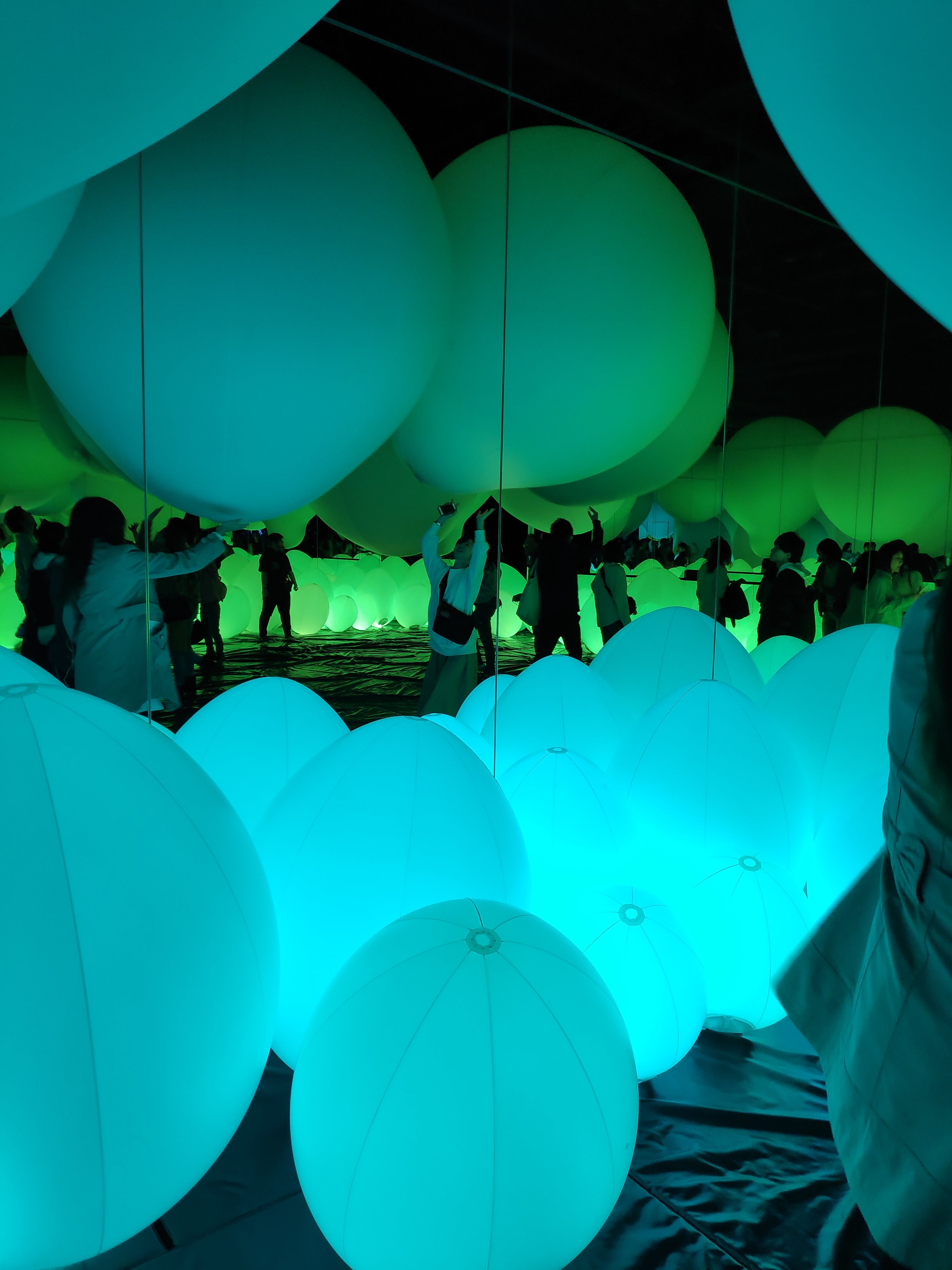 Und was uns da erwartete ist nur sehr, sehr schwer in Worte zu fassen. Und auch nicht so richtig in Bildern zu kommunizieren. So etwas hatten wir noch nie zuvor gesehen und es war ziemlich überwältigend. In einem Labyrinth von unzähligen kleinen und großen Räumen gibt es unterschiedlichste Installationen mit Licht, Projektionen mit Beamern (laut Website knapp 600 davon) und das alles passend untermalt mit spherischen klängen (oder mit viel Bass, je nach Raum). Da ist ein großer, verwinkelter Raum mit sich bewegenden Blumen, herum fliegenden Schmetterlingen und einem Wasserfall aus Licht. Oder der “Lantern Forest” bei dem man durch einen Wald von Glühbirnen wandelt. Oder ein bunter, Wabern der Nebel aus LED Leuchten, bei dem man vor lauter Spiegeln den Ausgang gar nicht richtig erkennen kann… Oder eine Tee Zeremonie bei der sich in der gläsernen Teeschale eine leuchtende Blume bildet, die verwelkt wenn man daraus trinkt und danach wieder von vorne zu wachsen beginnt… Einfach unbeschreiblich. Am besten selber hingehen und erleben. Wir waren über drei Stunden drin. Und wenn sie um 19 Uhr nicht geschlossen hätten wären wir da sicherlich auch noch länger drin geblieben…