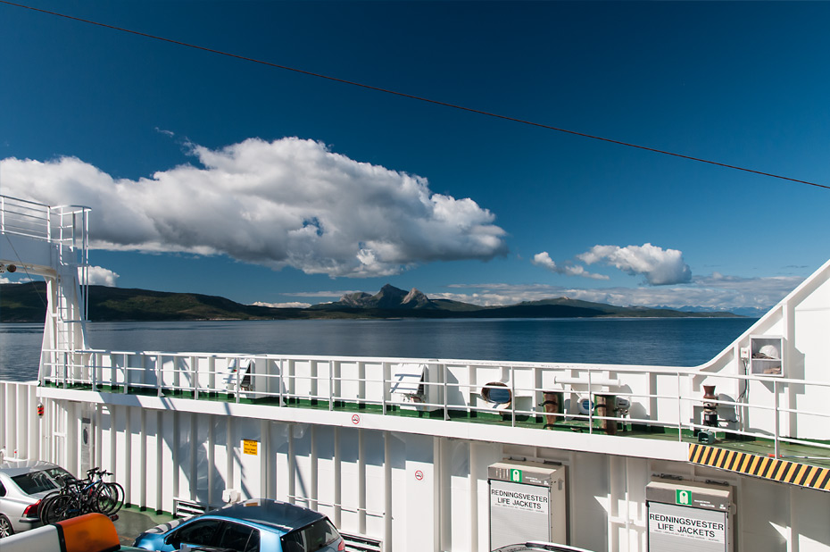 Und können unser Glück kaum fassen: wir haben super schönes Sonnenwetter. Mit der Fähre geht’s über den Tysfjord.