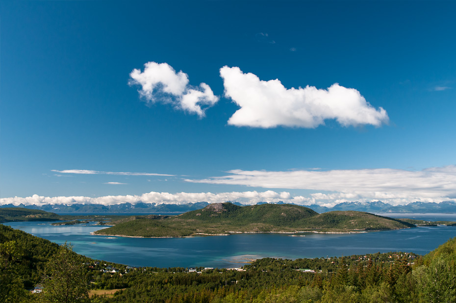 Nachdem die Fähre angelegt hat, sind es noch ein paar Kilometer bis zu unserem heutigen Ziel. Bald schon biegen wir von der E6 auf eine kleine Landstraße ein. Von einer Anhöhe sehen wir das erste mal die Bergkette der Lofoten am Horizont.