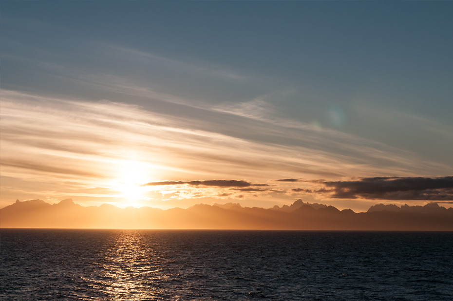 Normalerweise finde ich Fotos von Sonnenuntergängen eher kitschig. Aber hier kann ich nicht anders. Die Zacken der Lofoten, abgestuft in unterschiedlichen Schattierungen von hell bis dunkelgrau und wie sie sich gegen den gelben Horizont absetzen, sind einfach faszinierend. Es wird nicht das letzte Sonnenuntergangs-Foto dieses Urlaubs bleiben…