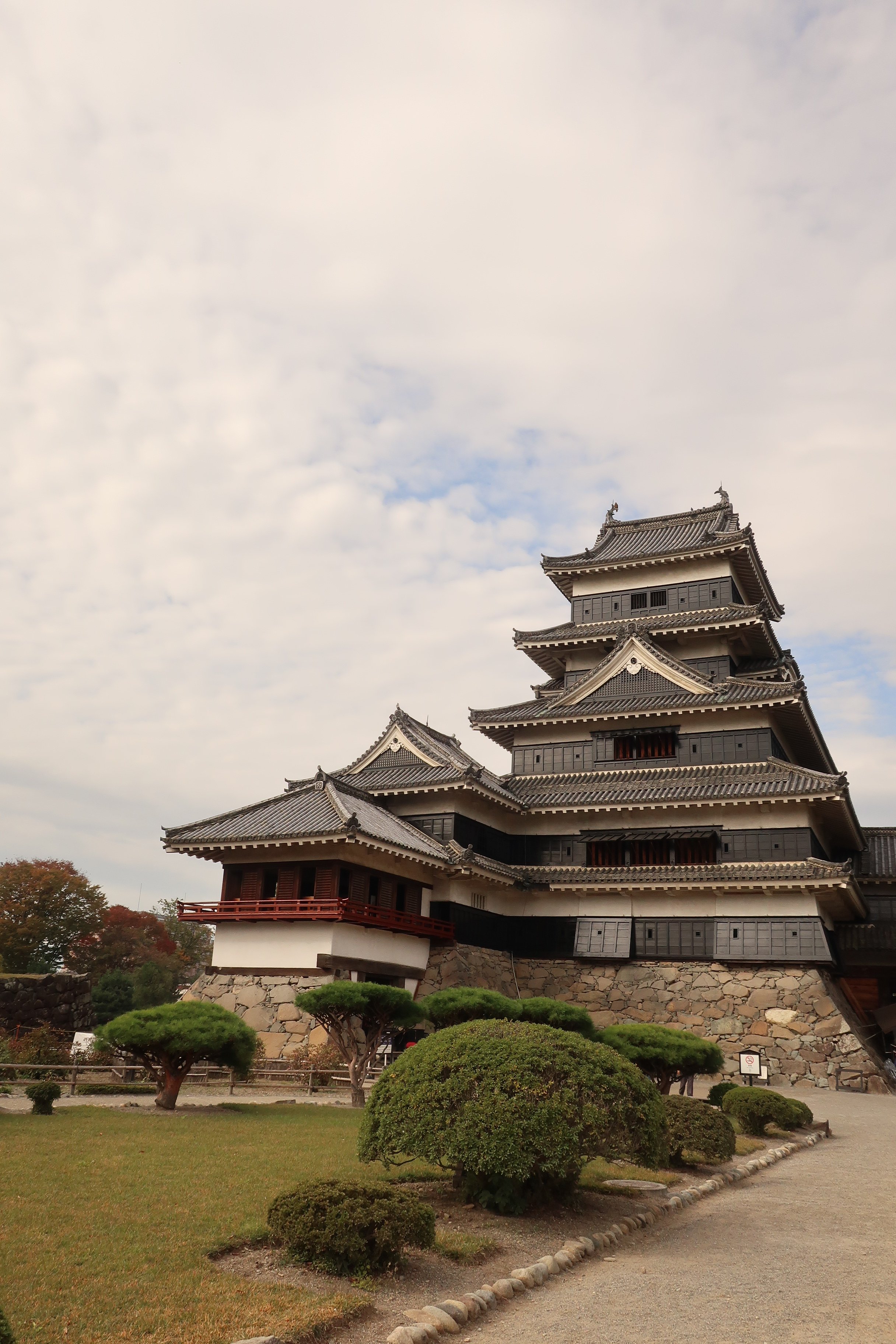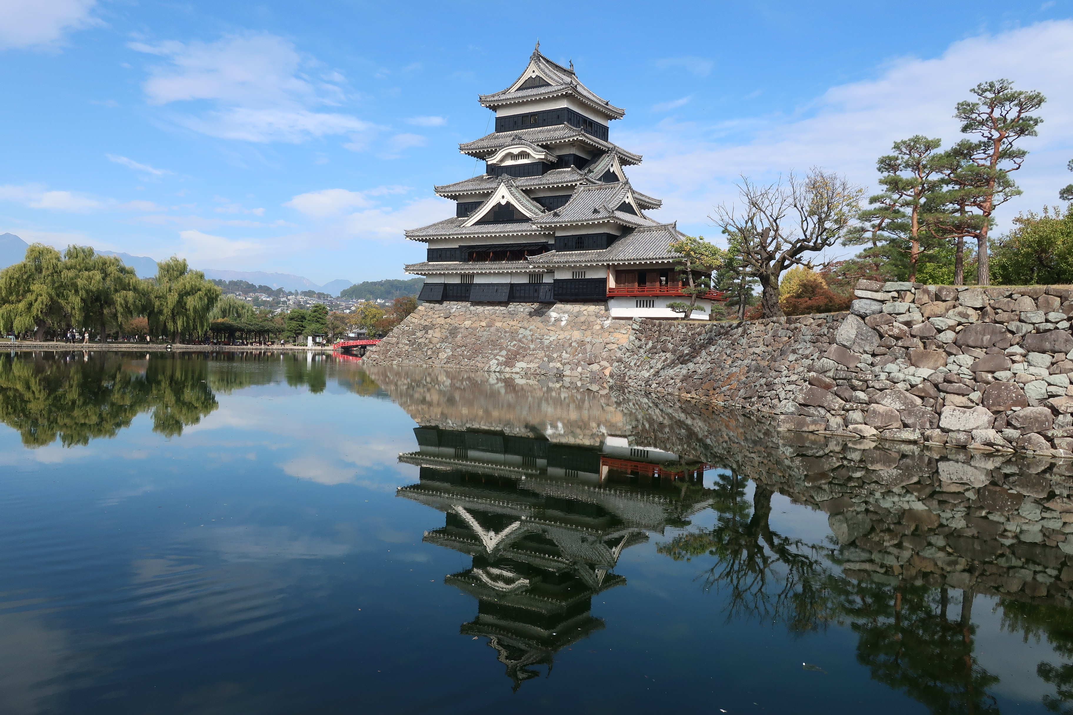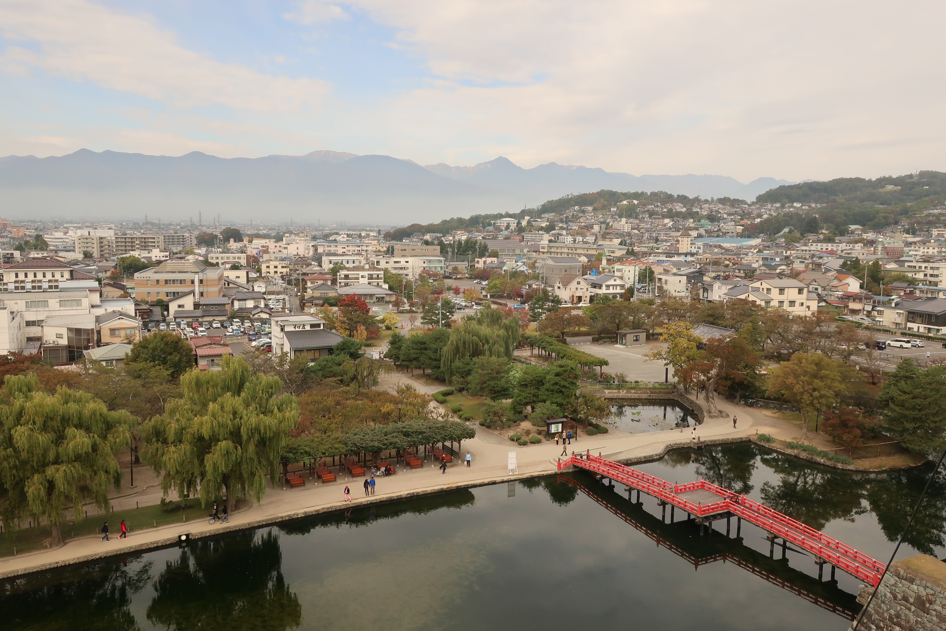 Matsumoto Castle im Morgenlicht. Zuerst ist es noch bedeckt, dann geht die Sonne auf. Innen hat man die Möglichkeit über steile Stufen in die oberste Etage der Burg zu kommen. Der Blick auf das Berg-Panorama rund um Matsumoto gleicht die Mühe aus.