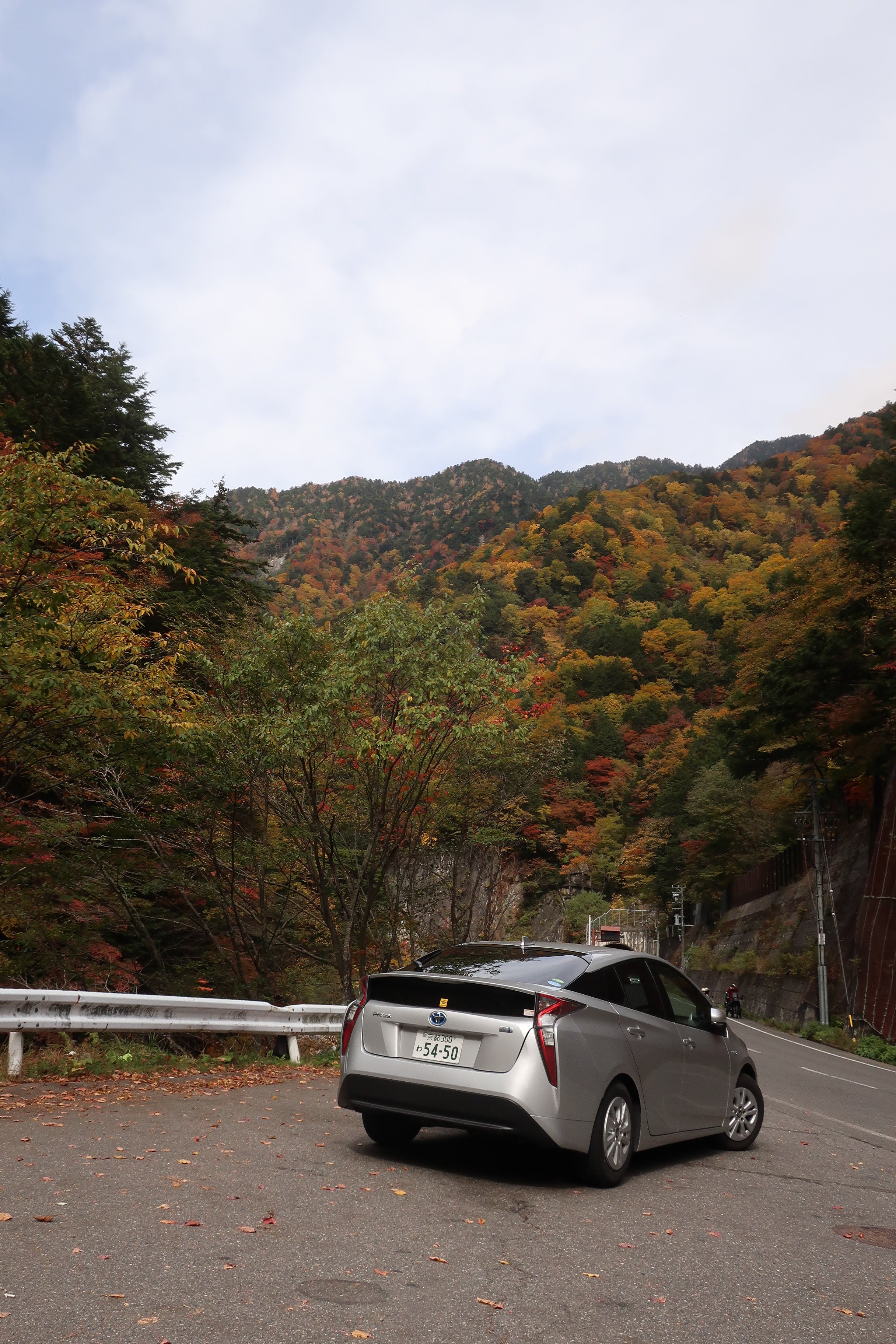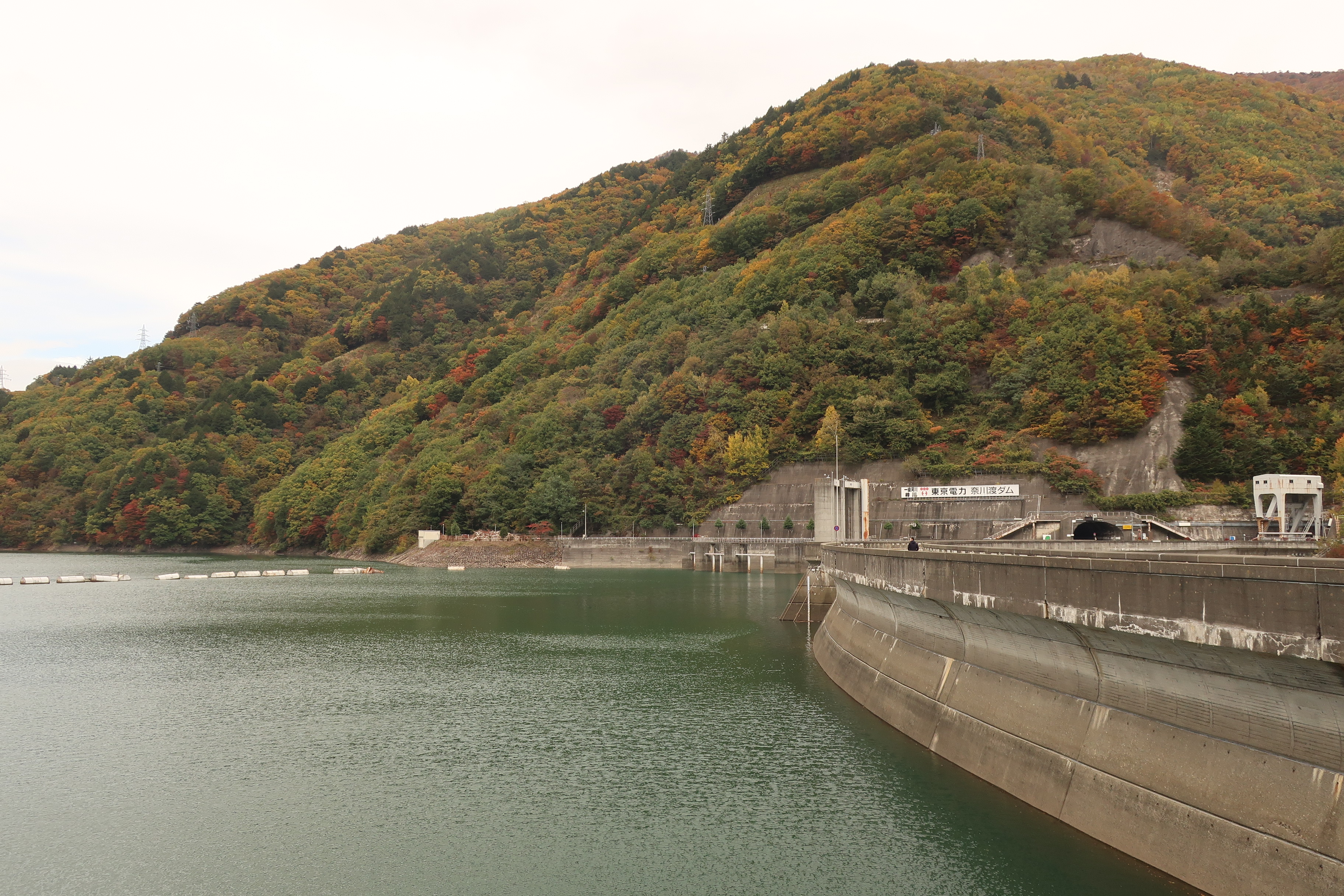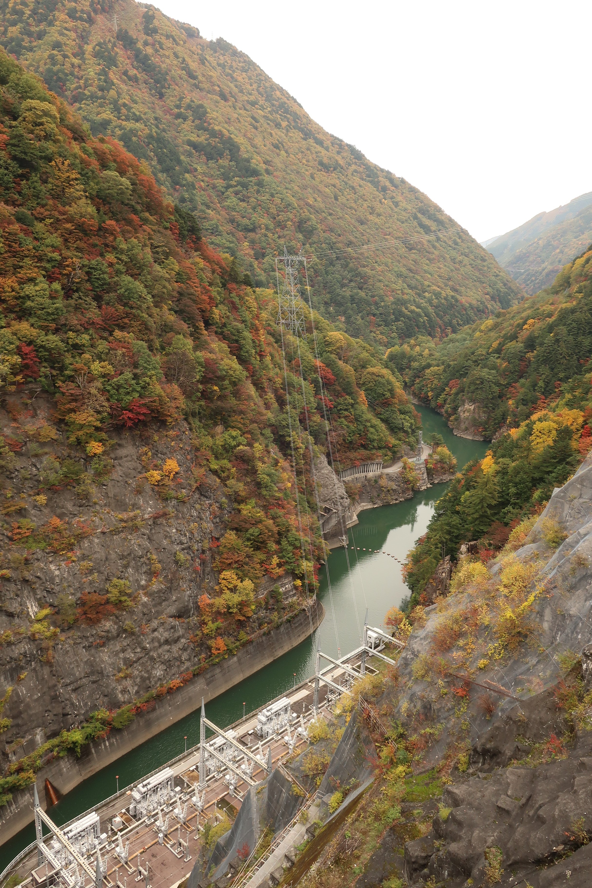 Wir fahren los in die Japanischen Alpen in Richtung Takayama. An der Kreuzung der Route 158 und 26 entdecken wir eine große Staumauer. Das Kraftwerk dazu sieht spannend aus. Von der Staumauer aus sieht man ins tiefe Flusstal hinab. Das Tal ist eingesäumt von bunten Laubbäumen.