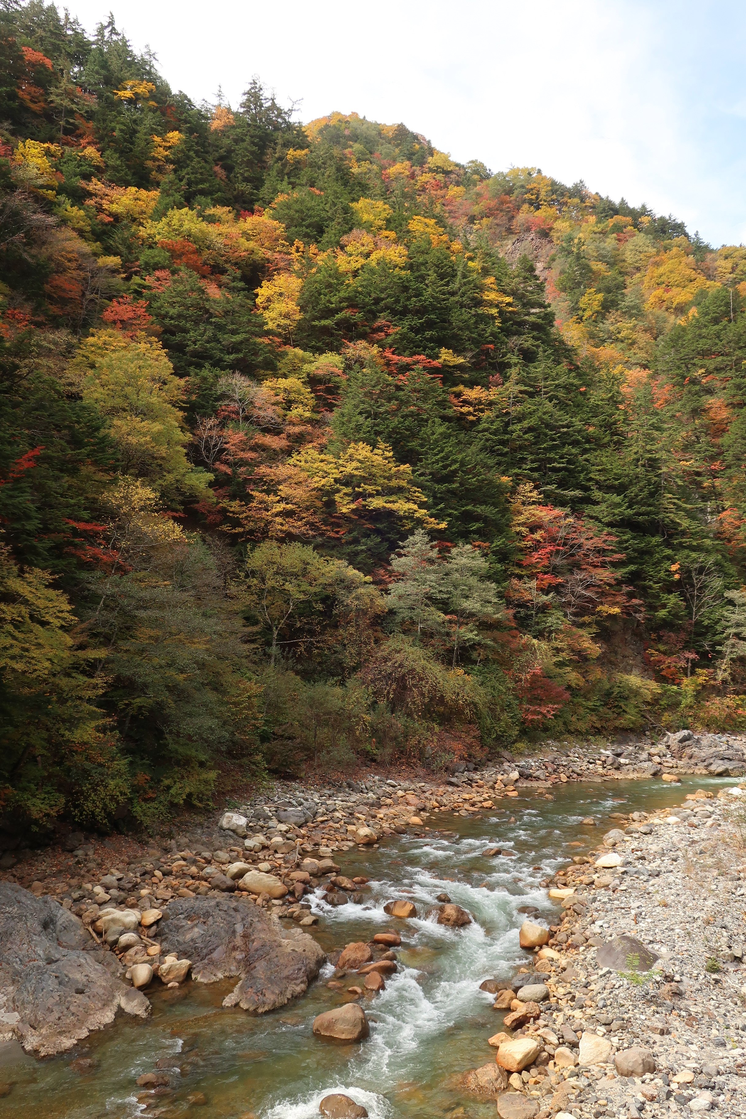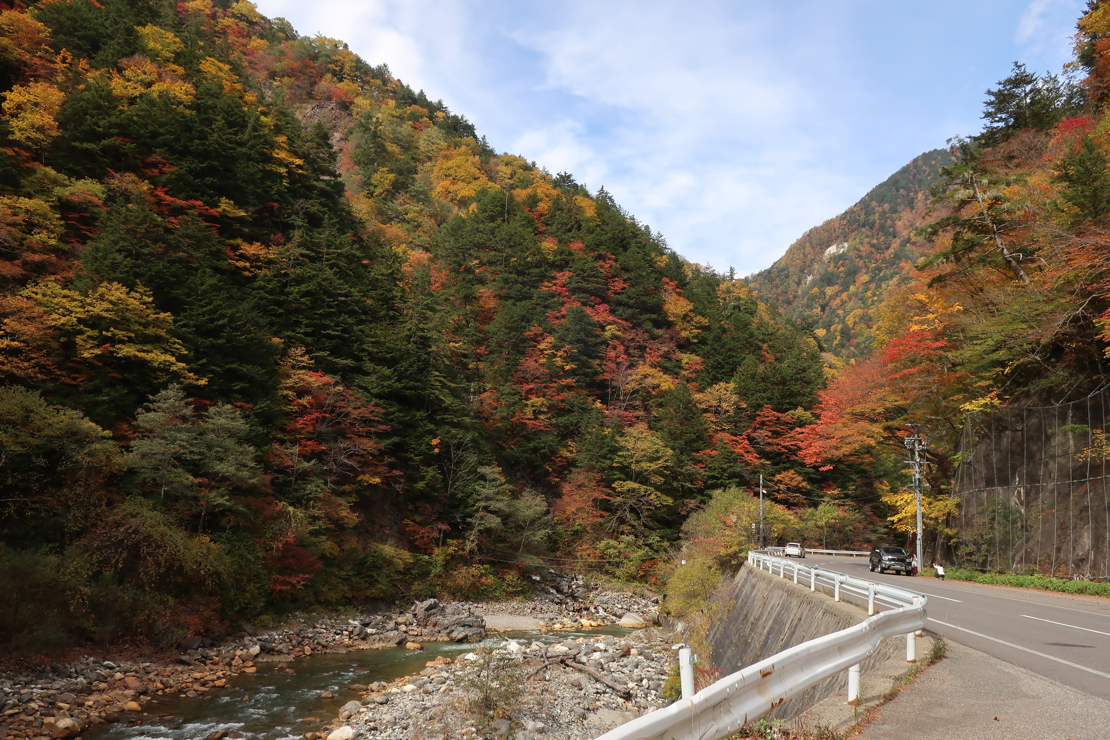 Die Fahrt durch die Berge auf der Route 158 führt durch eine traumhafte Landschaft. Unzählige Laubbäume mit bunten Blättern säumen den Fluss, der sich durch das Tal windet. Die Farben der Blätter sind beeindruckend. Wir halten immer wieder kurz an für Fotos (und sind damit nicht allein).