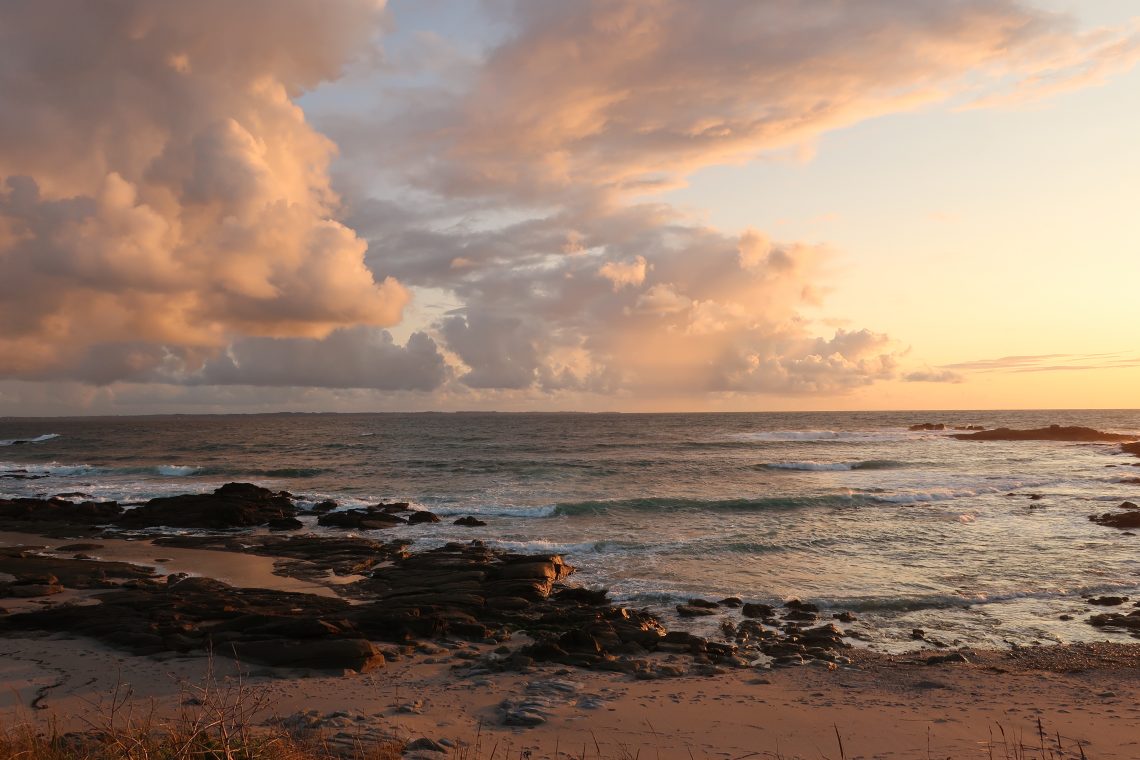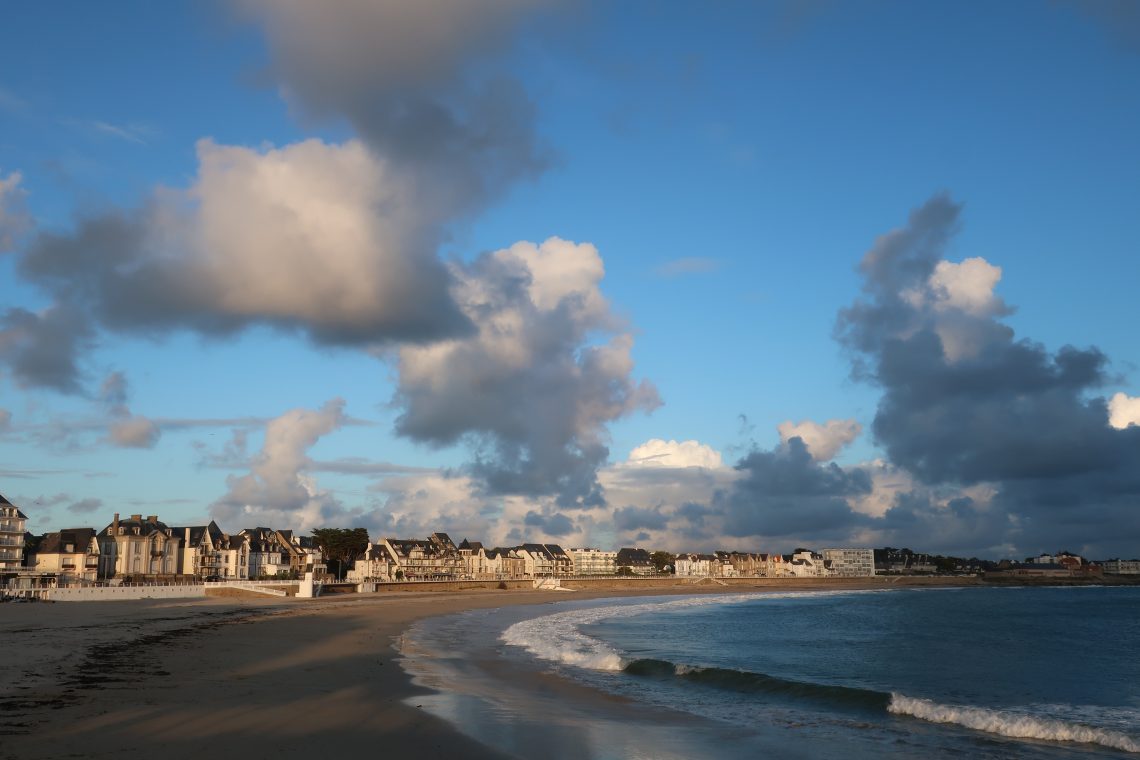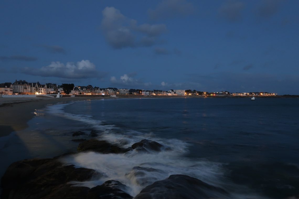 Abends fahren wir weiter nach Quiberon. Im Sonnenuntergang bummeln wir die Küste entlang. Die Flut kommt und mit ihr hohe Wellen und ein rauer Seegang. Eine Fähre verlässt den Hafen – und schaukelt ordentlich. Wir stehen am südlichsten Punkt als die Sonne hinter dem Horizont verschwindet. Der Wind pustet uns um die Ohren, es wird kühl. Die letzten Restaurants räumen die Tische außen ab. Es ist dunkel geworden.