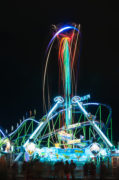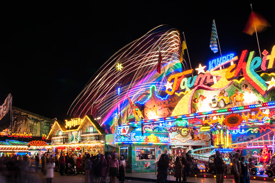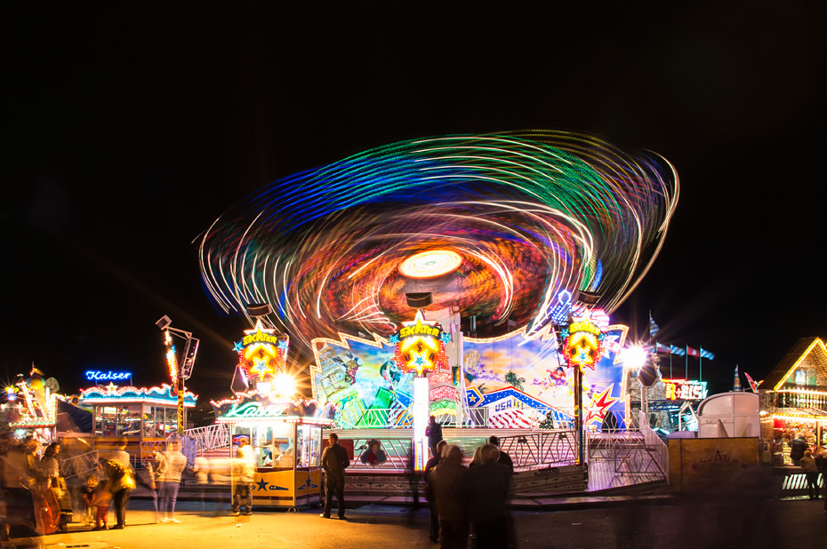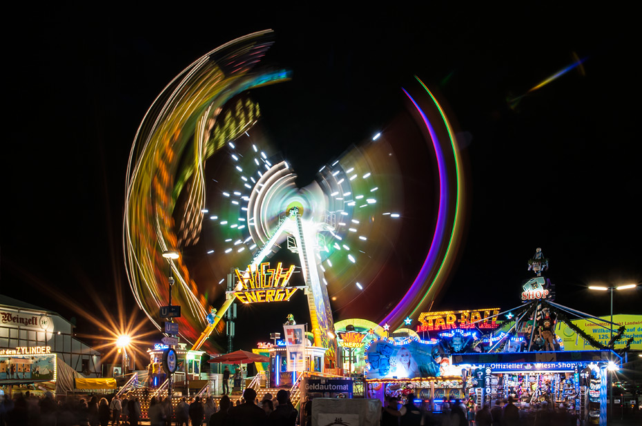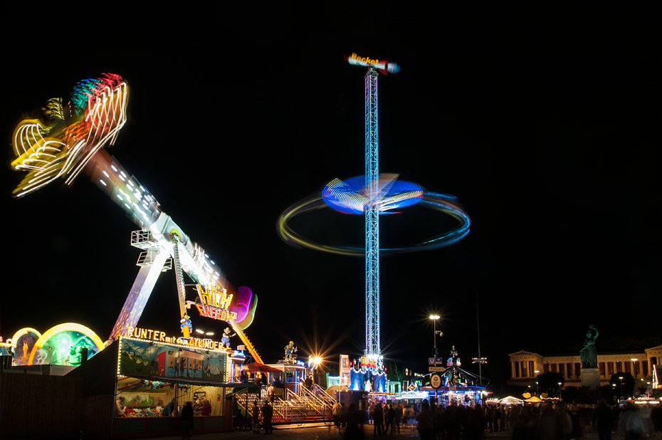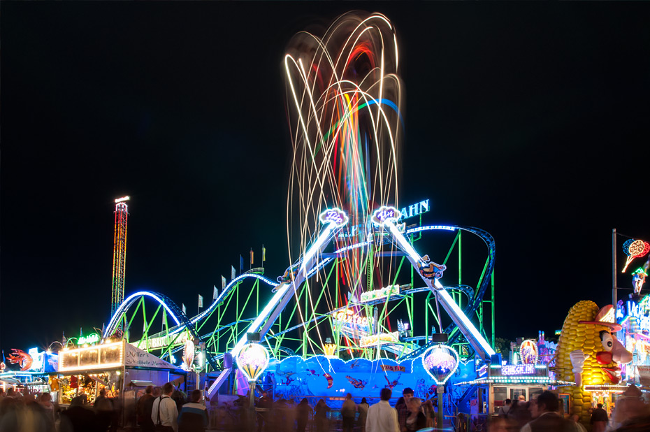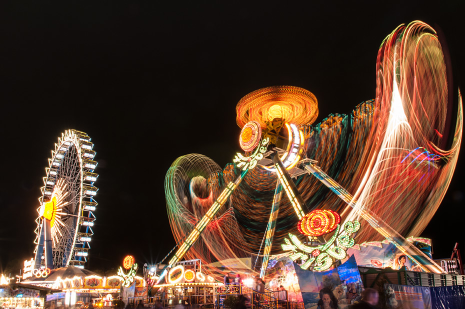 Je später der Abend, desto experimentiertfreudiger die Wiesn-Besucher. Ob die Experimentierfreudigkeit wohl in irgendeinem Zusammenhang zum Bierkonsum stehen mag? Darüber kann nur gerätselt werden. Abends sehen die Fahrgeschäfte jedenfalls nochmals um einiges aufregender aus. Wenn die Wahrnehmung etwas langsamer wird, die Farben verschwimmen und die Masse der Menschen scheinbar ineinander fleißt, ergeben sich faszinierende Augenblicke.