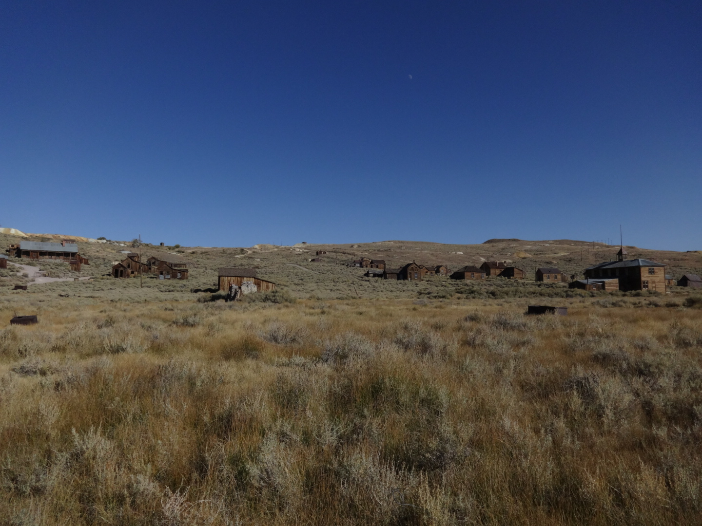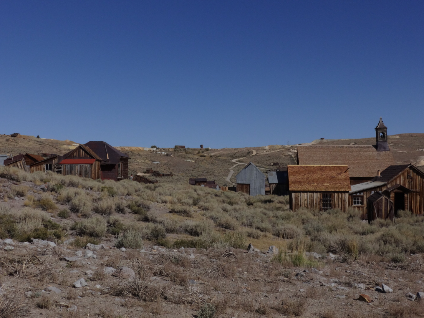 Um’s noch etwas gespenstischer zu machen, fahren wir nach Bodie. Ghost Town. Eine verlassene Goldgräber Stadt, die die Natur nun zurück erobern darf. Na ja, fast. Bodie ist ein Historic State Parc. Durch den Eintritt werden die Gebäude erhalten. Wir laufen durch die verfallenen Häuser. Ein leichter Westwind bläst durch die Gassen. Staub verwirbelt. Trockenes Gras überall. Die Stimmung ein wenig wie man sie aus Wildwest Filmen kennt. (Wären da nicht die anderen Touristen, die in ihren neon farbenen Shirts durchs Bild laufen.)