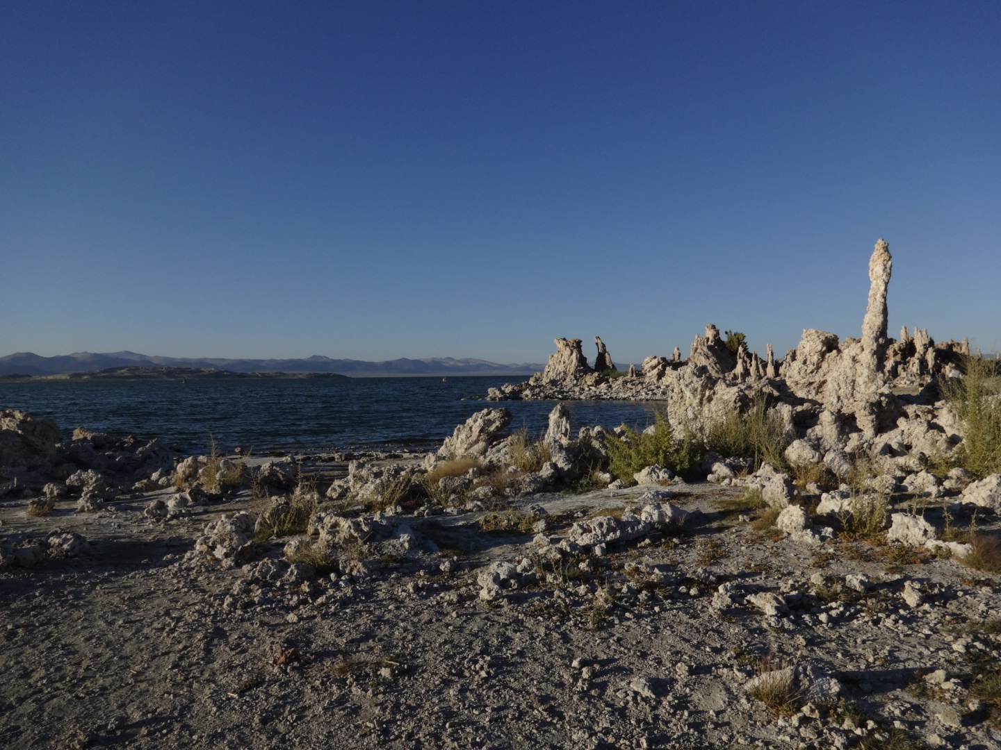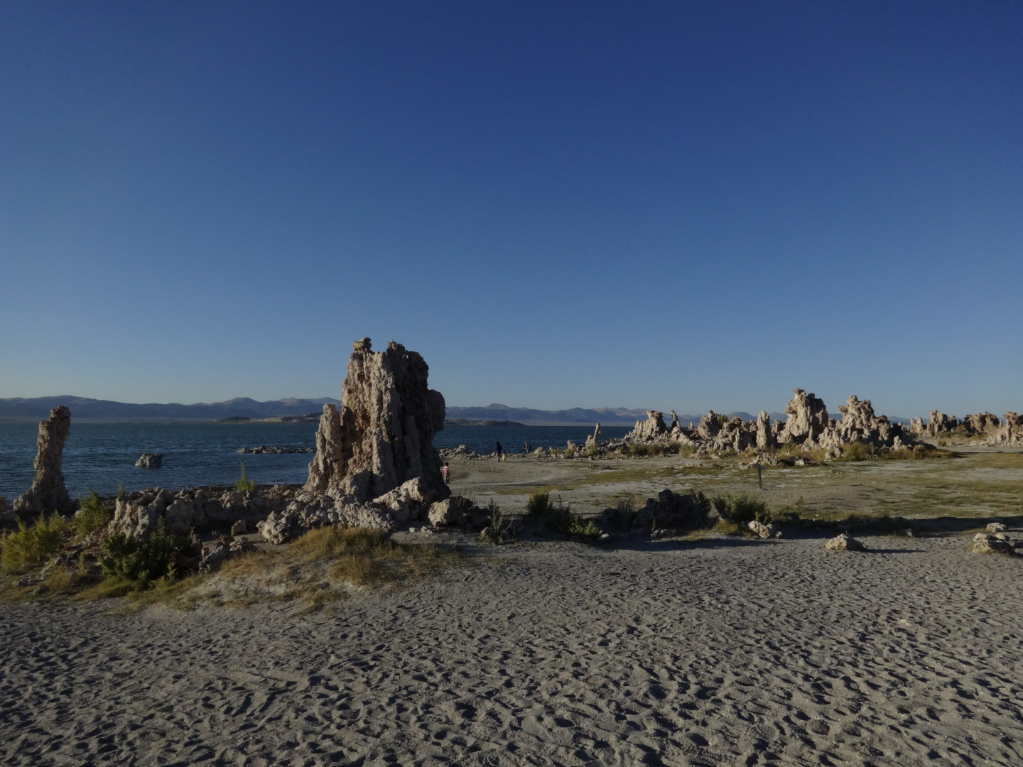 Am Ende der Tioga Road sehen wir schon von oben auf den Mono Lake. Der blaue See sticht aus seiner grau braunen, ausgetrockneten Umgebung heraus. Irgendwie unwirklich. Die Sonne brennt, kein Luftzug geht. Eine andere Welt im Vergleich zu den Tuolumne Meadows.