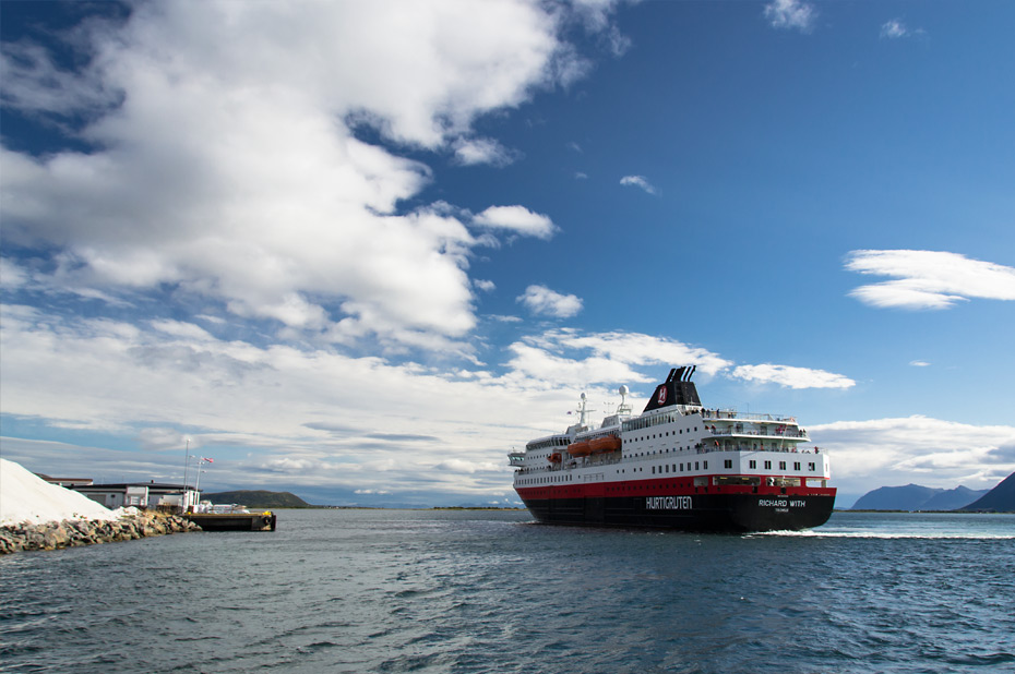 Durch Zufall treffen wir bei Risøyhamn nochmal auf eine Hurtigrute, diesmal die Richard With. Wir fahren kurz parallel bis das Schiff in den Hafen einbiegt.